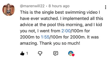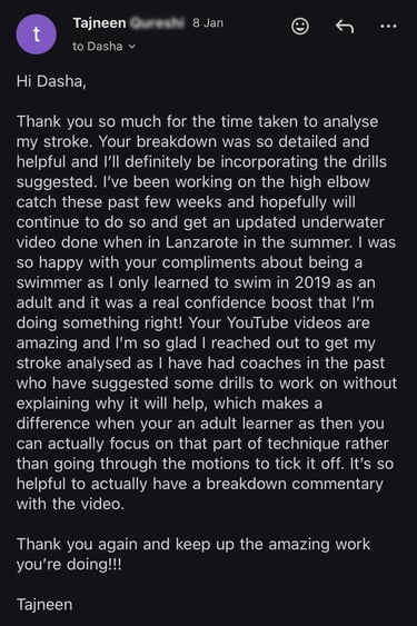 Send me a short swim video and I’ll break down exactly what’s holding you back, what you’re doing well, what needs fixing, and most important - how to improve it.