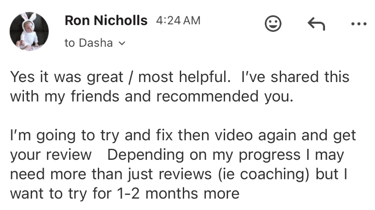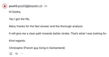 You’ll receive a clear video breakdown from me. I explain what to fix, why it matters, and how to fix it. I will give you drills which will help you improve faster.