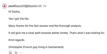 You’ll receive a clear video breakdown from me. I explain what to fix, why it matters, and how to fix it. I will give you drills which will help you improve faster.
