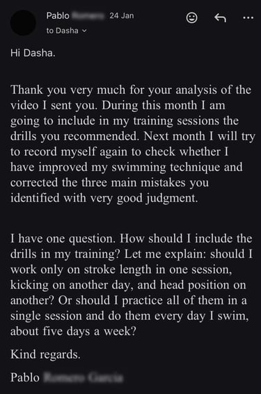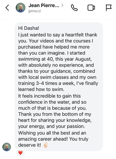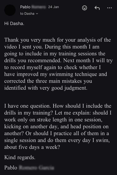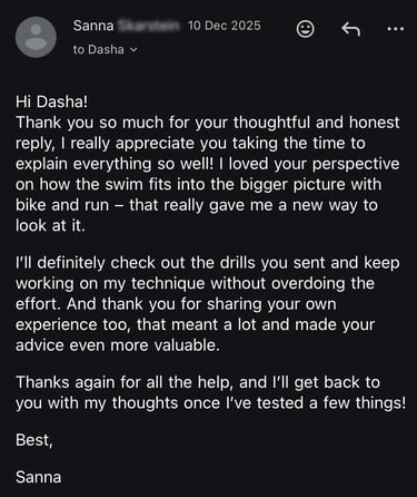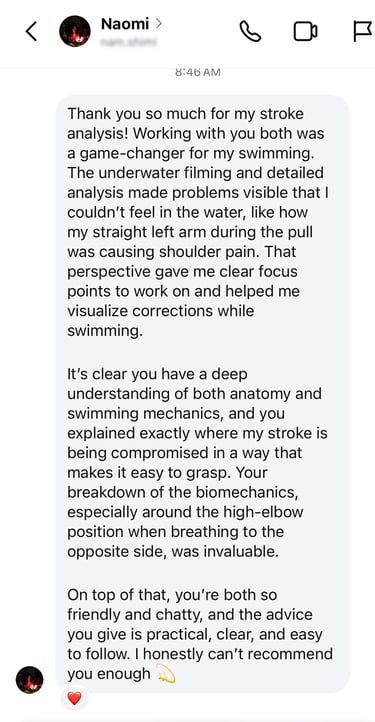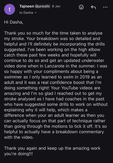 Send me a short swim video and I’ll break down exactly what’s holding you back, what you’re doing well, what needs fixing, and most important - how to improve it.